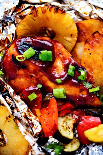 Cut 4 sheets, enough to wrap the chicken and veggies, of heavy duty foil. Place chicken on center of aluminum foil and divide the veggies and add 2-3 pineapple slices into each packet.