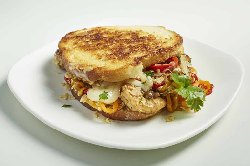Saute bell peppers and onion in 2 tablespoons olive oil in a large skillet over medium heat until crisp-tender. Remove from the heat. Transfer to a bowl. Cook and stir shrimp, salt, cumin and chili powder in the remaining olive oil in the same skillet over medium-high heat until shrimp turn pink. Spoon into a bowl. Place 2 slices of cheddar on each of four bread slices; sprinkle with ¼ cup tortilla chips. Layer each with pepper-onion mixture, shrimp, remaining tortilla chips and monterey jack. Top with remaining bread slices. Spread outsides of sandwiches with butter, lightly pressing together. Toast sandwiches on a griddle over medium-low heat for 2-4 minutes on each side or until bread is golden brown and cheeses are melted.