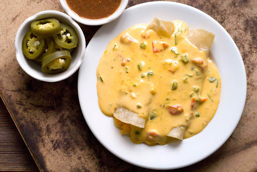 To make the queso, in a 2-quart saucepan, heat the butter on medium-low. Add the onion and jalapeños and while occasionally stirring cook until softened, about 5 minutes. Add the garlic and tomatoes and cook for 30 more seconds.