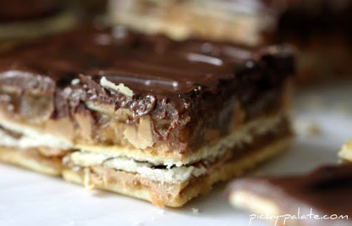 2. Melt butter and brown sugar in a medium saucepan over medium high heat stirring constantly for 4 minutes, until bubbly, smooth and creamy caramel forms. Pour 1/2 Cup or so of caramel over peanut butter chips then add another layer of crackers, peanut butter chips and caramel. Top with one final layer of crackers then spread with melted chocolate.