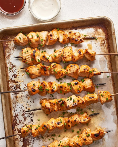Grilling instructions: Heat an outdoor grill to medium-high (about 400°F). Place the skewers on the grill (work in 2 batches if needed), cover the grill, and cook undisturbed until grill marks appear on the chicken, 3 to 4 minutes. Using tongs, flip the skewers, cover the grill, and grill until the chicken is cooked through, 3 to 4 minutes more.