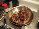 In a medium skillet over medium heat, melt the butter and olive oil. As soon as the butter and oil begin to turn golden and smoke, gently place the steaks in the pan. For medium-rare, cook for 4 minutes on each side. Once done, remove the steaks to a plate, tent with foil and set aside. Pour off the excess fat but do not wipe or scrape the pan clean.
