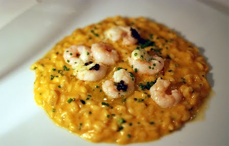 Por separado cocina los camarones en un sartén sin nada, con el aceite que tienen será suficiente. Ponlos por encima del risotto