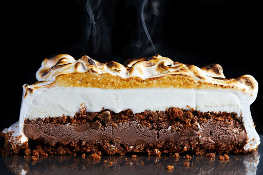 8. Spread the marshmallow over the ice cream cake in an even layer and freeze for 1 more hour. Torch the marshmallow to your desired doneness. Then slice and serve.