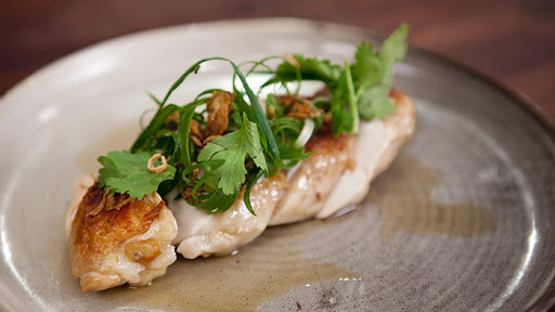 Remove from the bag and in a medium frying pan heat a little vegetable oil over high heat. Cook the chicken, skin side down for 3 minutes or until the skin is crispy.