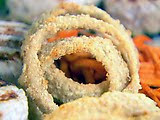 Place the remaining flour in a sealable plastic bag, then add onions, and shake to coat. Dip onions 1 at a time into the buttermilk mixture, then dip into potato chip crumbs and place on baking sheet. Spray canola oil evenly over rings and bake for 20 minutes, or until coating is crisp. Season with salt, to taste, and serve immediately.