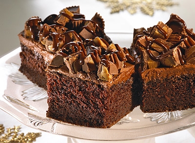 4 Remove wrappers from peanut butter cups; cut each cup into 4 pieces. Prepare ONE-BOWL BUTTERCREAM FROSTING. Reserve 1/3 cup frosting; frost cake with remaining frosting. Sprinkle peanut butter cup pieces over frosting. Place reserved frosting in small microwave-safe bowl. Microwave at MEDIUM (50%) 15 seconds or until pourable; drizzle over cake. Allow drizzle to set. 12 to 16 servings.