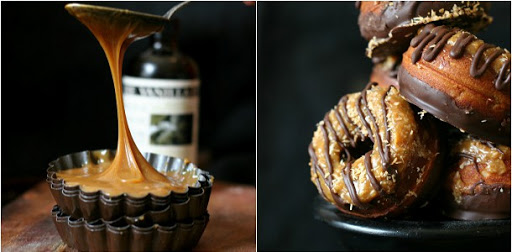 4.Once the chocolate is set, remove donuts from the freezer. Spread a little coconut caramel on the tops of each donut.