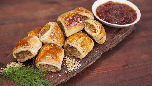 Separate the egg white and egg yolk. Place each pork mince log in the centre of each pastry rectangle. Brush one long edge with the egg yolk wash. Lift up the non-washed edge and roll it firmly over the filling to join with the egg yolk wash side underneath.