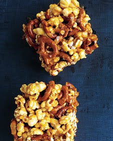2. Pour caramel mixture over popcorn and pretzels and quickly stir with a rubber spatula to coat. Transfer mixture to dish and use a piece of plastic wrap coated with cooking spray to press evenly into dish. Sprinkle with coarse salt if desired. Let cool completely before cutting into 12 bars. (Store in an airtight container, at room temperature, up to 2 days.)