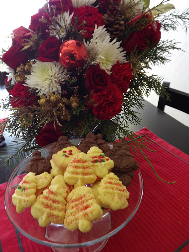 Use cookie press to press on cookie sheets. Bake at 375 degrees F. 8-10 minutes.