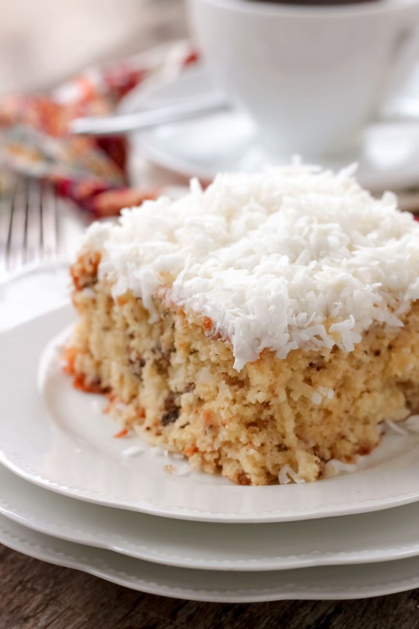 Place the cake mix, vanilla instant pudding, eggs, water and oil in a large bowl. Using an electric mixer, beat for 2 minutes. Fold in the coconut and chopped pecans. Pour the batter into your prepared 13×9 inch pan. Bake 45 minutes or until golden brown on top and a tooth pick inserted in the center comes out clean. Remove from the oven, place on a cooling rack to cool completely before frosting the cake.