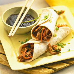 3. Heat tortillas following label directions. Brush each with extra hoisin sauce. Spoon pork mixture down center of each. Roll up; serve. A serving of each recipe constitutes an entire meal; you don't need side dishes. Keep this in mind when evaluating the nutrition info provided. Makes 10 rolls.
