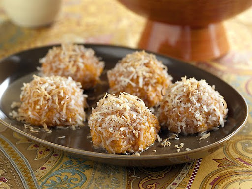 Bake the potatoes until tender, then peel and mash them. Stir in the brown sugar, orange juice, zest and nutmeg. In a separate bowl, toss the coconut with the sugar and cinnamon. Press mashed potatoes around each marshmallow, creating a 2 to 3-inch diameter ball. Roll the balls in the coconut mixture. Bake for 15 to 20 minutes. Watch carefully for the last few minutes of cooking; the expanding marshmallows can cause the potato balls to burst open.