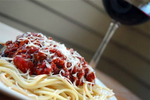 Spoon sauce over drained spaghetti noodles and sprinkle with parmesan cheese.