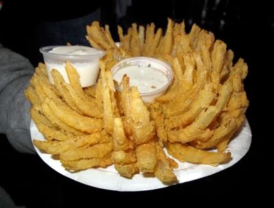 Freír la cebolla en el aceite durante 10 minutos o hasta que estén doradas. Sacar del aceite y dejar escurrir en un estante o toallas de papel. Abrir el centro de la cebolla a lo ancho, para que pueda poner el tazón pequeño de salsa en el centro