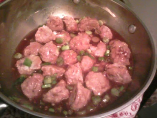 1 In large bowl, whisk together egg and milk. Tear bread slices into bite sized pieces and add to bowl. Stir to coat and let sit 10 minutes. Add ground chuck, garlic, pepper, salt, and cayenne. Make meatballs (I came out with 28). 2 Place on a cookie sheet sprayed with cooking spray. Cook at 325 F for about 10 minutes. Turn once. Cook an additional 10 minutes. Drain. 3 Combine every other ingredient except green onions. Add to a pan and cook until thickened stirring constantly. Pour over meatballs. Add chopped green onions. 4 The original recipe called for frying the meatballs, but I like baking them instead and draining off the grease. Use whichever method you prefer.