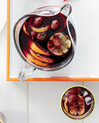 In a large pitcher, combine the wine with the simple syrup, brandy and grilled fruit and stir well. Refrigerate until the sangria is chilled and the flavors are blended, at least 1 hour and up to 8 hours. Serve the sangria over ice.