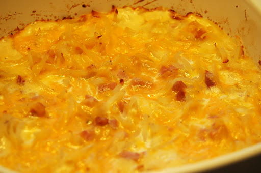 2. Stir in the potatoes, cheese, onion, green pepper and ham.