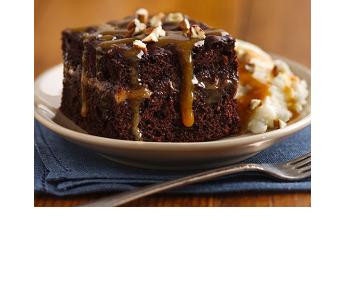 Bake 25 to 28 minutes or until cake springs back when lightly touched. Run knife around sides of pan to loosen cake. Cool at least 30 minutes. Serve with ice cream, drizzle with toppings and sprinkle with pecans. Store loosely covered.