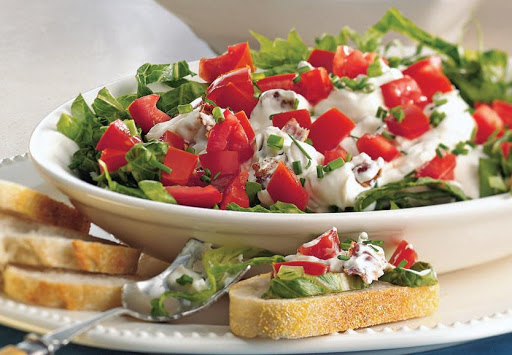 Arrange lettuce in shallow bowl or on small platter. Spoon sour cream mixture over lettuce. Top with tomatoes; sprinkle with chives. Serve with baguette slices.