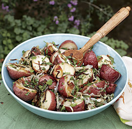 In this dish, hardy herbs are roasted with the potatoes and onions, infusing them with flavor. Then tender herbs are tossed with the hot potatoes just before serving; the heat brings out the herbs’ flavors, but they stay green and fresh tasting.