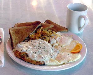 Bob "Daddy-O" Wade -- the Texas artist who made the famous dancing frogs for the roof of Carl's Corner Truck Stop on Interstate 35 -- inspired this CFS marinated in jalapeno juice. Bob used to step lively around town until his wife Lisa tamed him and took him off to the mountains. These days Daddy-O's hankering for hot times is often satisfied by a chicken-fried steak.