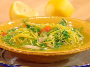 To the first soup pot add onions, carrots and garlic, and season with salt and pepper. Cook to tender then add lemon zest and stir. Add the steeped saffron stock and bring to a simmer. Add asparagus, peas, chicken and noodles*; and cook about 5 minutes then remove from heat. Stir in lemon juice, herbs and serve.