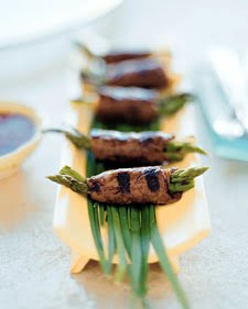 Dip a piece of beef in soy-sauce mixture, and place on a clean surface. Season with pepper. Place 1 piece of scallion and 2 asparagus tips across 1 end of beef, so vegetables extend over edges; roll. Set aside. Repeat with remaining beef and vegetables.