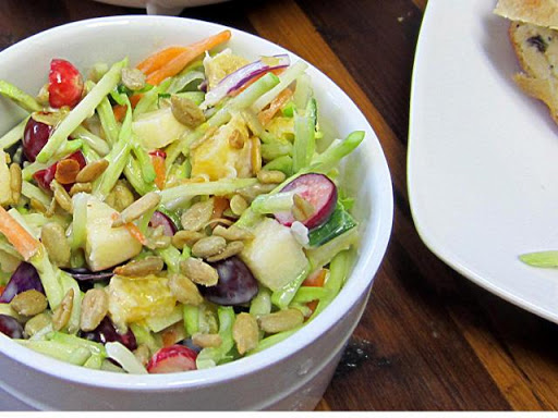 Not your average slaw, because this is made with broccoli rather than with cabbage. And then we add in some fruits and nuts.