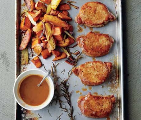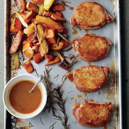 Cider Dijon Pork Chops with Roasted Sweet Potatoes & Apples