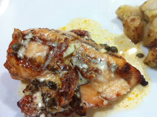In a medium sauce pan, add chicken broth and cook over high heat until reduced by half. Stir in cream; reduce heat to medium and cook, stirring frequently, until mixture is reduced by one-third. Add Gorgonzola, garlic, and pepper. Stir until cheese melts and sauce is creamy. Stir in sun-dried tomatoes. Serve chicken with desired amount of Gorgonzola sauce and capers.