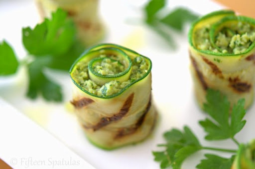 Place a spoonful of artichoke pesto into each zucchini ribbon, and roll it up into a little roll. The artichoke pesto is sticky so it should stick together well. Serve and enjoy!