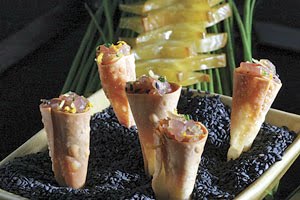 2. Place about one tablespoon of the tuna mixture in each wonton cone. Line a deep serving plate with a thick (about one-inch) layer of black sesame seeds. Arrange the cones, pointy-side-down, in the sesame seeds. Garnish with scallion curls and diced red bell peppers.
