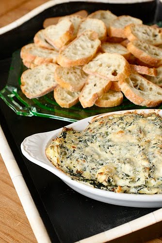 Preheat the oven to 400˚ F. In a medium bowl, combine the cream cheese, Parmesan, sour cream, mayonnaise, spinach, artichokes, roasted garlic, salt and red pepper flakes. Mix well with a rubber spatula until all ingredients are evenly blended. Spread into a small baking dish (I used a gratin dish). Sprinkle additional grated Parmesan over the top if desired. Bake for 35-40 minutes or until the top is slightly browned. Serve warm with baguette slices, pita chips, crackers, etc.