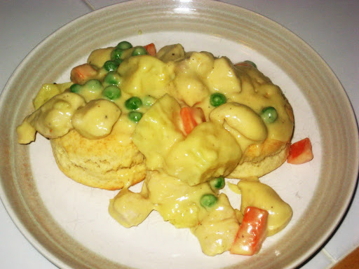 Make a white sauce with the butter, flour and milk. Add any additional seasonings you may want such as sage or thyme or as pinch of celery salt. Add chicken and peas.