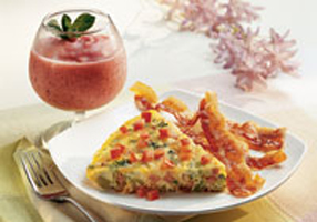 In 10-inch skillet heat oil over medium-high heat until hot. Add onion and potatoes; stir and cook about 5 minutes. Cut asparagus spears into thirds. Add asparagus and ham to skillet. Meanwhile, in a medium sized bowl beat eggs and pepper; stir in Parmesan and cheddar cheeses. Reduce skillet heat to medium-low; pour eggs over potato mixture. Cover; cook 14-16 minutes or until egg mixture is set in center. Remove from heat. Sprinkle diced tomato over frittata. Cut into wedges and serve with Fully Cooked Bacon Slices, which have been heated according to package directions. Sprinkle bacon with sesame seeds if desired.