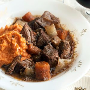 2. Cover and cook on low-heat setting for 8 to 9 hours or on high-heat setting for 4 to 4-1/2 hours. Serve beef mixture over mashed sweet potatoes. If desired, season with additional salt and coarsely ground black pepper. Makes 6 servings.