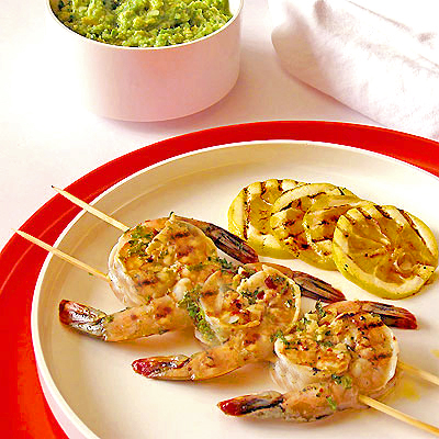 Grill the shrimp over medium-hot coals until they are barely cooked through, about 3 to 4 minutes total, turning halfway through. Grill the lemon slices until softened and well marked by the grill. Place the shrimp and lemon slices on plates and top with the salsa. Serve warm or at room temperature.