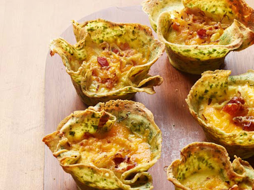 In a nonstick 6-cup muffin tin, place one crepe in each cup. Make sure the edges of the crepes are slightly pleated and overlap the edges of the cups slightly. Spoon the bacon and onion mixture into each cup. Distribute the cheese evenly among the cups. Pour the egg mixture into the cups so all the quiches are the same size. Transfer to the oven; bake 25 to 30 minutes, or until the egg mixture is completely set. Let rest 5 minutes before serving.