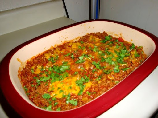 Brown ground beef in skillet with southwestern seasoning. Add water, salsa and enchilada sauce. While beef is cooking, cut flour tortillas into 1" pieces. Spread half the tortilla pieces in bottom of deep dish baker. Cover with half the meat mixture, half the cheese, and half the cilantro. Repeat the layers, leaving the cilantro off the top. Heat in microwave on high for 4 -5 minutes until hot and cheese is melted. Sprinkle with remaining cilantro. May serve with sour cream (not in calorie count)