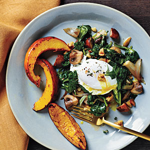 2. Combine 8 cups water and white vinegar in a large saucepan, and bring to a simmer. Break each egg gently into pan. Cook 3 minutes. Remove eggs using a slotted spoon. Spoon 2/3 cup mushroom mixture onto each of 4 plates. Top each serving with 1 egg. Sprinkle evenly with remaining thyme, pepper, and walnuts.