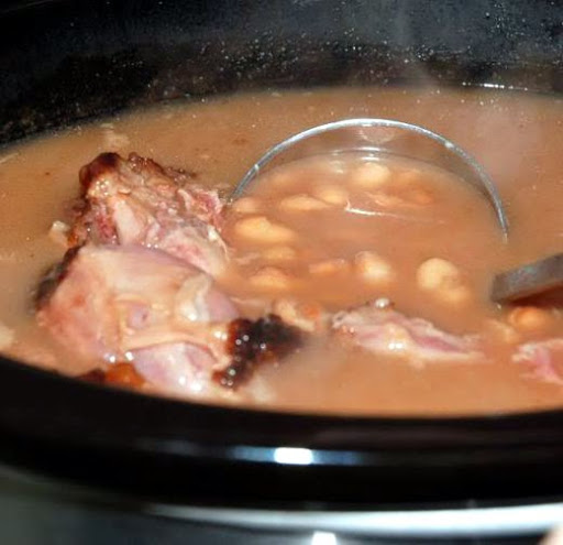 1. Add ham hock to slow cooker with beans and pour in ham soaking liquid.