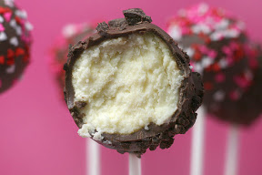 Note: It will really help if you use a bowl that is deep enough to completely submerge the pop in chocolate and remove in one motion. It also helps if your chocolate is on the thinner side. (You can melt a little shortening in it to thin it out some.) Once, you remove it, carefully tap the excess off while balancing the pop on the stick. You may need to rotate your hand so that gravity keeps the pop in place long enough for the chocolate to start to set around the base. Add the decorations before it sets too much also or they won’t stick to the surface. These were slightly harder to manage than the cake pops. One… they were larger and heavier because of using the scooper. Two… the cheesecake texture wasn’t as sticky as the cake pop mixture.