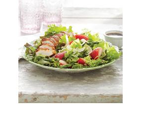 4. Arrange arugula, lettuce and endive on a serving platter or individual salad plates. Top with asparagus, strawberries and chicken. Serve with dressing.