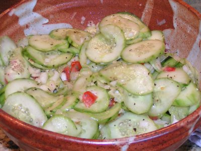 In a small bowl whisk together all the dressing ingredients. When you are ready to serve, rinse the cucumbers to get all the salt off and drain. Add to tomatoes and onions. Toss with dressing.