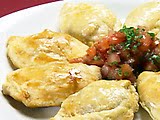 Roll out puff pastry dough and, using a circle cutter, cut out 16 to 24 (3-inch) diameter dough circles and place on a lightly greased baking sheet. Place a spoonful of meat mixture on 1 side of each pastry circle. Fold each into a half-circle and seal edges by pinching the dough together. Brush surface of pastry with egg wash. Bake until golden brown, about 6 to 8 minutes.