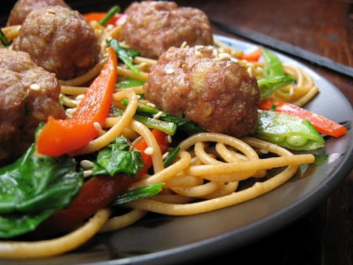 13 Garnish with sesame seeds and top with lots of meatballs.