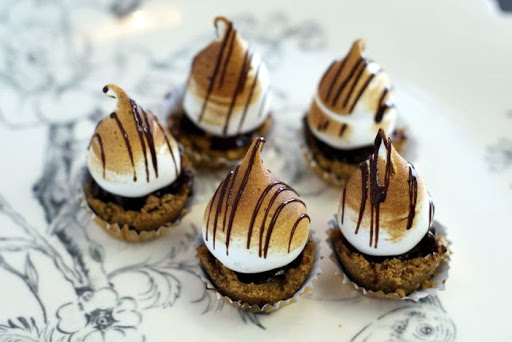 Transfer meringue to pastry bag fitted with large pastry tip. Pipe small dollop on top of each ganache-filled tartlet. Char meringue with kitchen torch to deep golden brown just before serving.