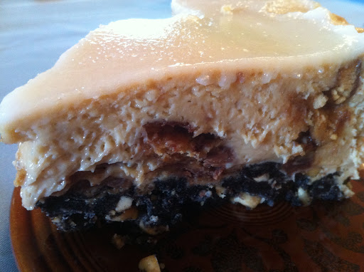 To make the crust, combine crushed Oreo cookies and peanuts, that have been ground in a food processor, with the melted butter. Pat the crust mixture onto bottom and sides of a 10-inch springform pan.